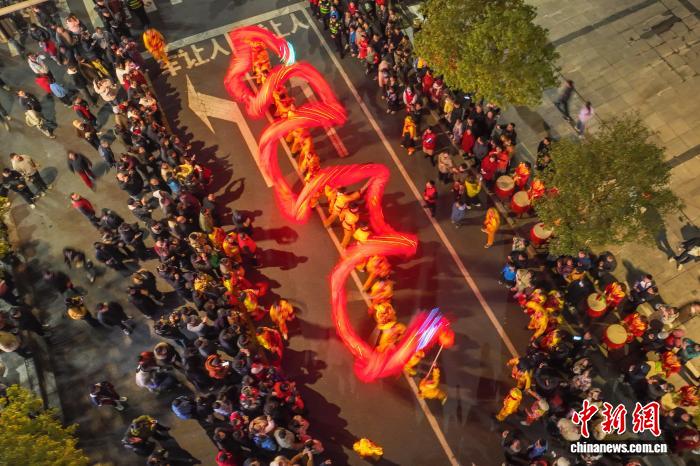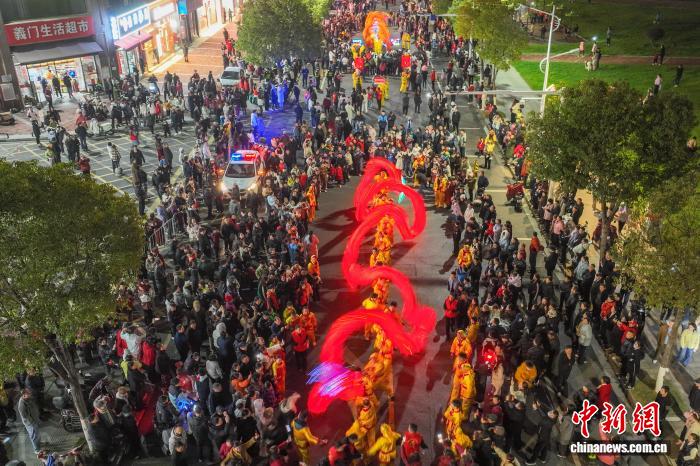 3月2日,元宵节前夜,“龙腾狮跃”迎献岁巡回举动正在江东北昌湾里办理局举办,夜色当中,1条条龙灯、板灯龙翩翩起舞,采莲舟、牙婆、蚌壳粗、渔人、浮薄花篮、北狮、扇子舞等风俗轮流演出,吸收了浩繁公众沿街旁观。图为巡回现场,出色的上演吸收浩繁公众沿街旁观。(无人机相片)中新社记者 刘力鑫 摄